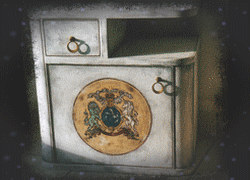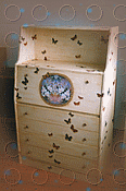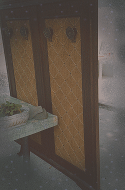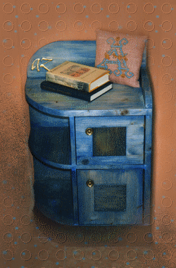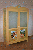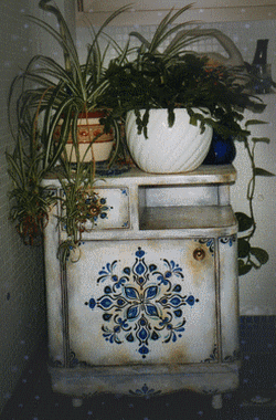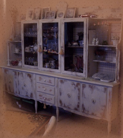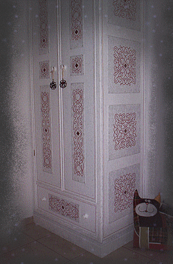 Sognavo un armadio per la biancheria... a misura.. l'ho ricavato da vecchie casse di porte, assemblate con vari passaggi e applicazioni, le porte ed il cassetto, provengono da pezzi di truciolare laminato, la decorazione e' costituita da applicazioni di formelle dipinte con un motivo di greche, il tutto è bianco spugnato grigio...il gattone... un fermaporta ..."infiltrato"!