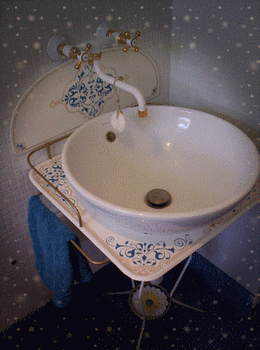 ...bagnetto, giallo bianco e blu, lavabo vecchio dipinto,