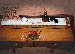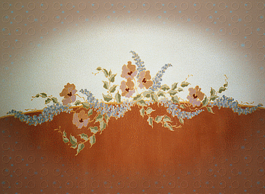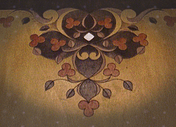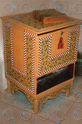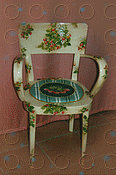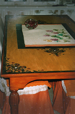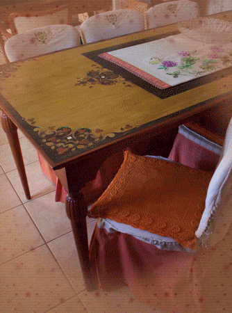 Sul tavolo deve esserci stato un vetro, ma quando l'abbiamo trovato non c'era piu', cosi ho rifatto il piano con un compensato, decorato con un disegno di trifogli che ho trovato e adattato, ripassato a pirografo e decorato con la tecnica del finto intarsio.