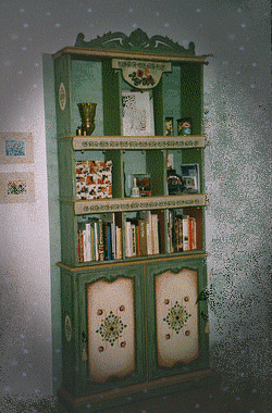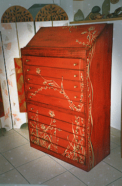 Da due moduli della libreria, un unico mobiletto-scrittoio, ho pensato di dipingerlo con un motivo simil- giapponese, base colore: acrilico rosso, anticato nero, vernice all'acqua...