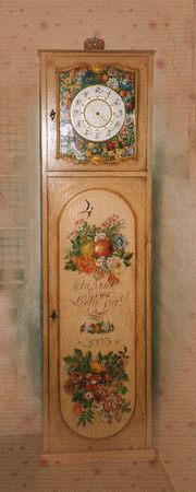 Beh, l'orrido mobiletto del pianerottolo di un vano scale diventa orologio "gran classe"...Tanti passaggi...decoupage pittorico, calligrafia a pennello, inserimento meccanismo, quadrante dipinto, rifinitura a craquele, molto realistica (frutto di esperimenti casuali!), patina anticante, vernice..."e...chi vuol esser lieto sia." Il mobiletto..., penso lo e'!