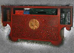 Da una vecchia libreria, i moduli chiusi così lineari sono diventati una base per varie possibilita', in questo caso: mobile tv rosso un po' orientaleggiante con chiusura a bastoncino, un medaglione dorato di lamina di rame lavorata ad embossing, dipinto e borchiato...una trasformazione totale! E poi la parte "cassetti" di un grande armadio guardaroba trasformata in cassettiera singola...